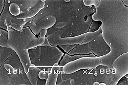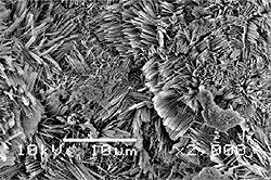 | プラズマ溶射法のもつ高温、急冷過程によ り、分解・溶融状態で基盤に到達するため、写 真のような飴状にガラス化した様子が観察さ れます。 分解生成物として強アルカリ性を示すCaO等を 含有するため、結晶性が低く、純度が低くなっ ています。 | 表面にHA特有の針状、六角柱状の結晶が観 察され、HAの純度が高いことが観察できます。 |