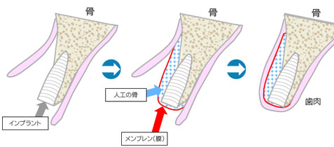通常の植立においてもよく使われるテクニックで、少量の骨の欠損部を移植骨や人工骨でカバーし、その上から特殊なメンブレンと呼ばれる人工膜で覆うことでインプラント表面の露出を防ぐ方法です。